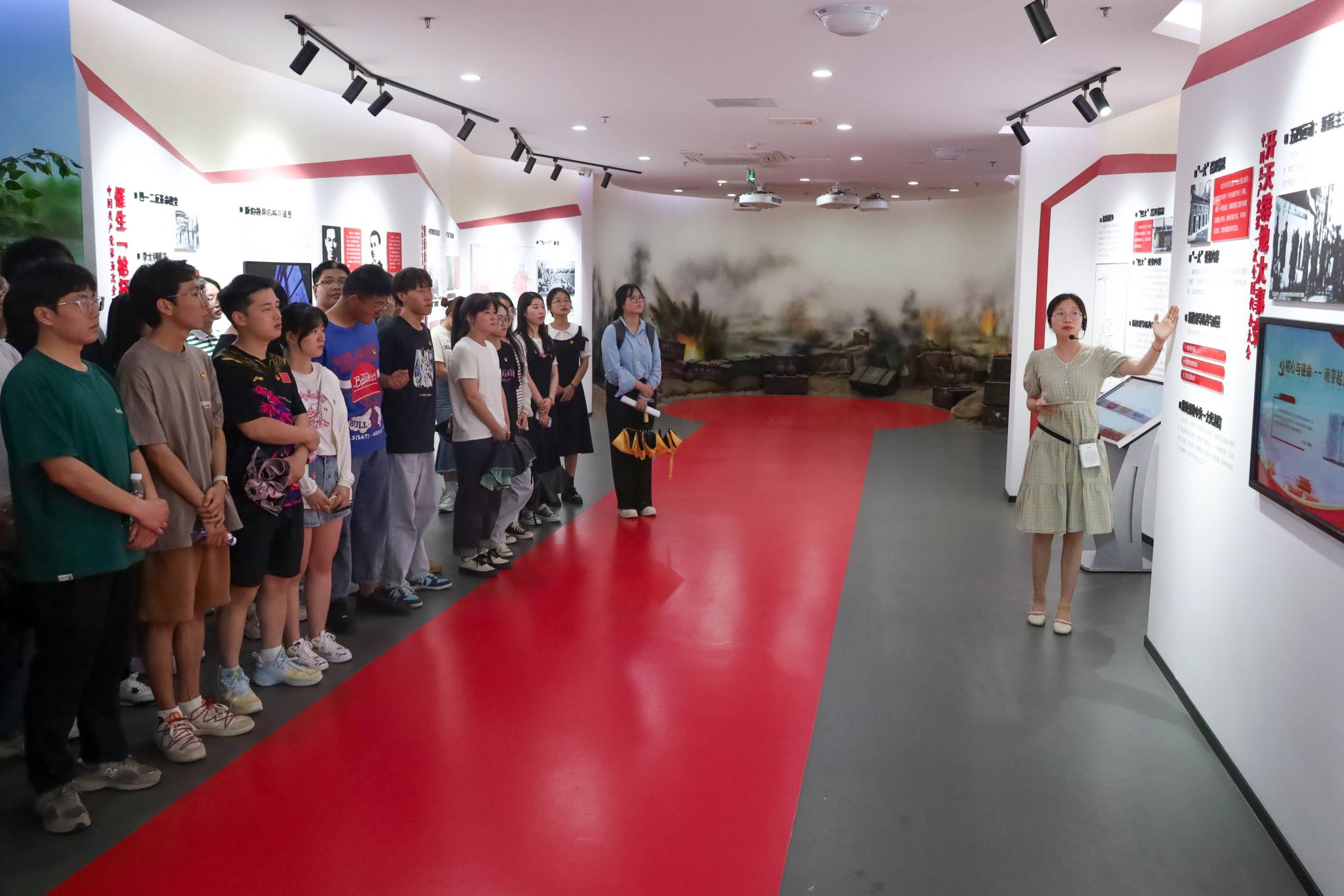 党建馆共有中共党史、学“习”区、锋领宜秀三个功能展区。步入党史展示区,员工党员们看到一艘缩小的红船模型,红船背后,投影仪投射的视频生动地再现了中国共产党诞生的场景。结合馆内的音频、影像等数字媒体技术,讲解员详细讲述党史、新中国史、改革开放史、社会主义发展史、中华民族发展史等五史知识,员工党员们深切感受中国共产党从诞生到发展壮大的百年历程。