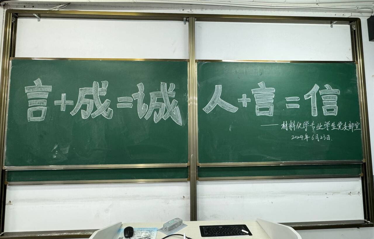 材料化学专业员工党支部组织策划全体员工党员开展“书写诚信标语”实践活动。“当前,党纪学习教育正在全党开展,在考场教室书写诚信标语,不仅是对党员的一次自我警示,也是对党员纪律意识的一次检验。”材料化学专业2022级(1)班陈雨疏作为新党员,在黑板上认真书写“言+成=诚,人+言=信”宣传标语,深有感触地表示,“身为新发展的党员,应该自觉遵守考试纪律,坚守诚信原则,做到言行一致,为班级同学树立榜样!”