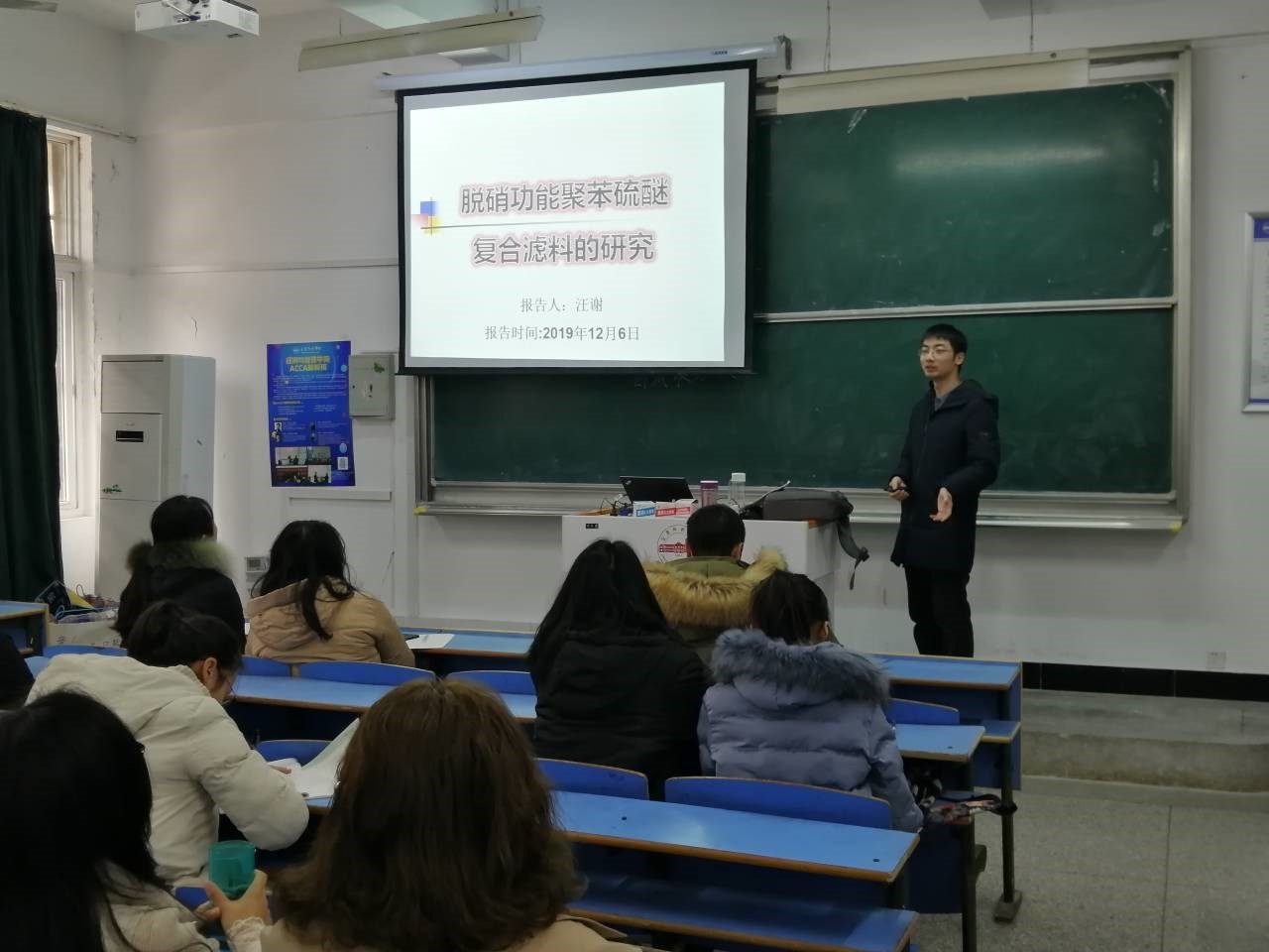2019年12月6日上午10点,tyc41183太阳成集团青年教师汪谢博士在龙山校区教学楼C105教室作了一场题为“脱硝功能聚苯硫醚复合滤料的研究”的学术报告,公司材料化学专业部分教师及16、17级部分本科生参与了这次学术交流活动。