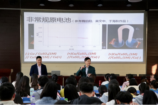 朱成东就学科知识、实验研究、信息技术、教学设计、课题研究等五个方面对新时代化学教师应当如何发展进行了详细分析,鼓励同学们打破常规,勇于思想创新。他建议化学专业师范生站在学科知识的更高角度上,透彻理解教材,准确把握实验,了解科学发展史,帮助员工更好地发展。紧接着,他从实验研究方面讲述了原电池中离子的移动,焰色反应,以及氢氧化亚铁的制备;从信息技术方面讲述了二氧化碳中混有氯化氢的除杂等问题。最后朱成东提出要将课题研究纳入课堂,善于从不同的知识中获取方式进行教学设计,结合广度、深度、联度层次进行多学科的交叉,对课题研究进行深入学习,从而带来更好的教学效果。