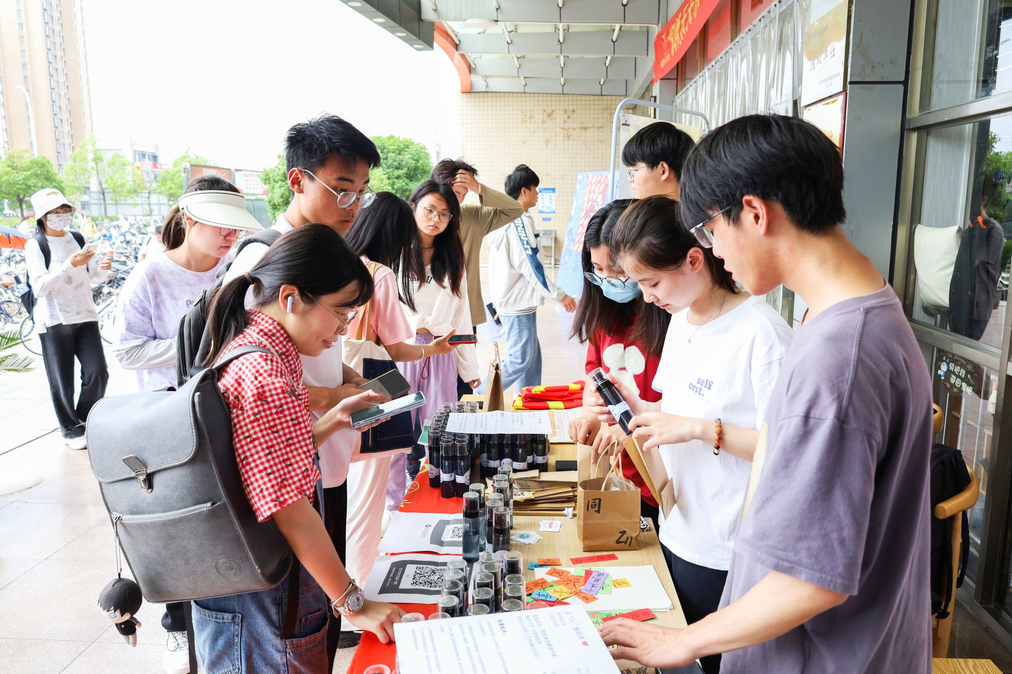 手工制品在摊位上摆放整齐,印有书法字样的牛皮纸包装吸引了来往师生的注意。公司东、西苑食堂门口,活动负责人、化学工程与工艺专业2022(1)班的班长黄顺向员工们介绍驱蚊液的成分和效果。贴上院徽标签、赠送祝福贴纸,每一份手工产品还配有由公司员工自制的书法小卡片,寄托着员工们对助力公益者的美好祝愿。