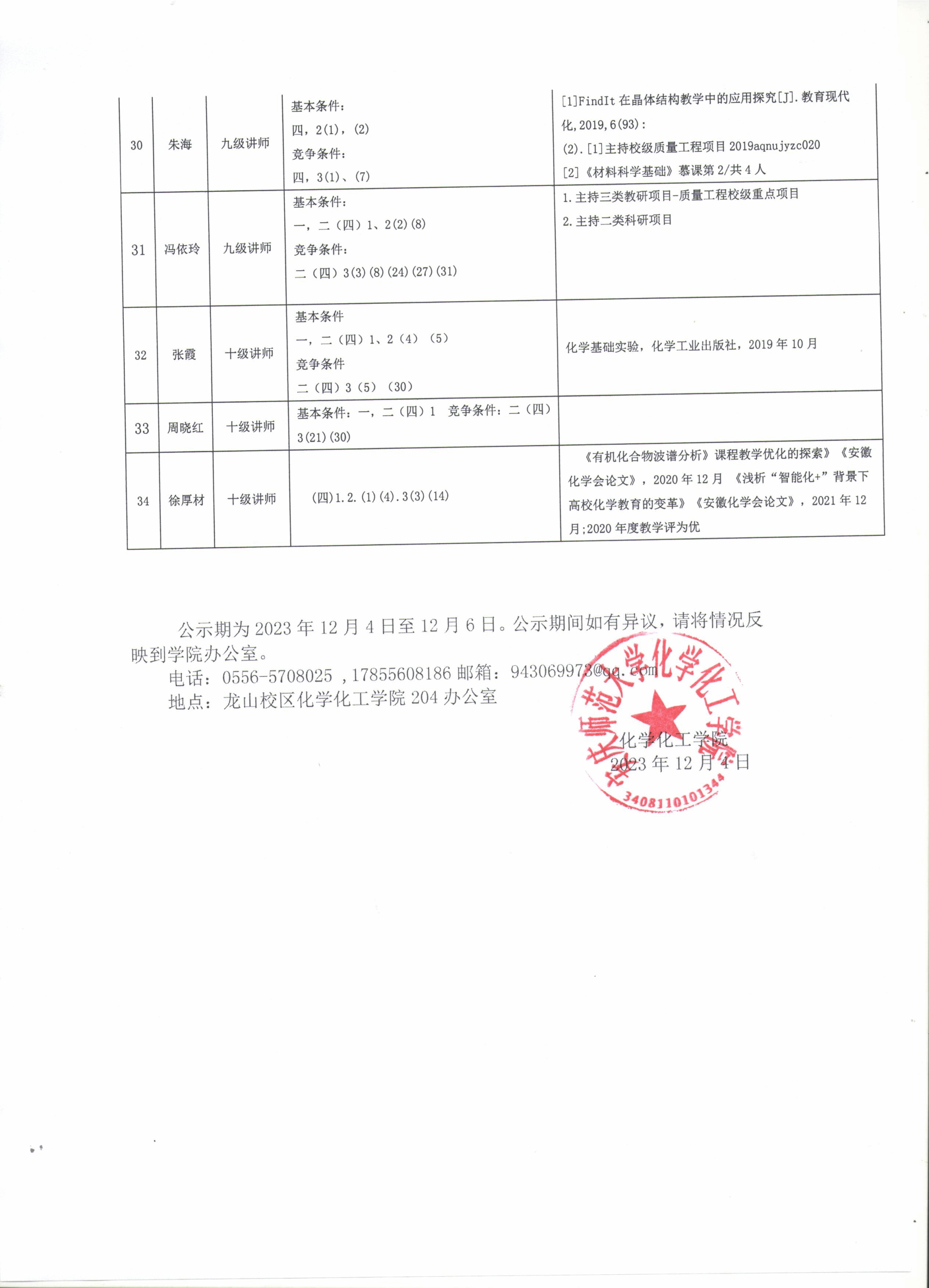 17 | 孟岩 | 六级副教授 | 基本条件: 一,二(三)1 竞争条件: 二(三)2(1)(7)、3(1)(2) (10)(27)(35)) | 1.基于视频多媒体课件的无机化学实验创新性教学研究,长春大学学报,2022,2,93-95,三类。 2.刺激响应型自旋交叉双稳态磁性材料的设计合成及性质研究(KJ2020A0511),2020,安徽省高等公司自然科学研究重点项目,三类,排名第一。(阶段性成果: Inorg. Chem., 2022, 46, 18743–18751; ChemElectroChem., 2022, 9, e202200246; CrystEngComm., 2021, 23, 4700-4707; 工业催化, 20022, 7(30), 31-39) |