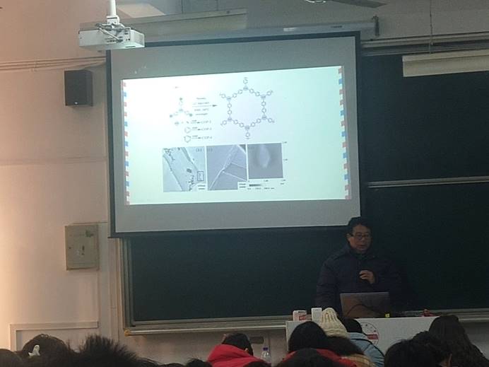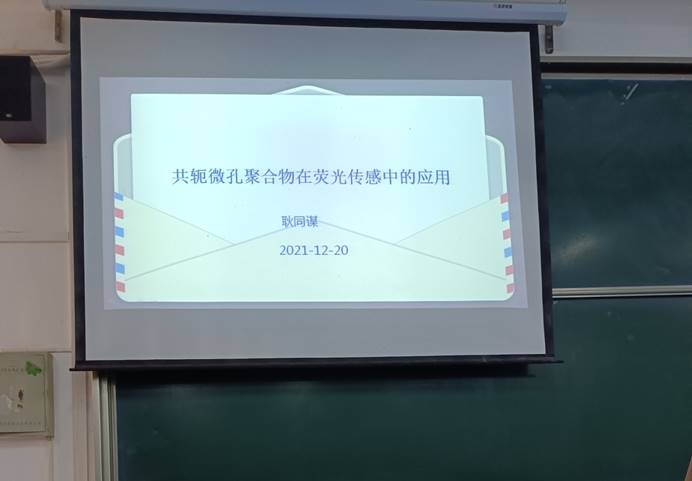 12月20日上午,tyc41183太阳成集团耿同谋教授在龙山校区教学楼C105室作题为“共轭微孔聚合物在荧光传感中的应用”学术报告, 2019级材料化学专业本科生参加了本次报告会。