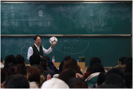 而讲到杂化轨道时,郑兰荪更是巧妙利用足球教具展示了五元环和六元环在C60中的结构关系,揭露了隐藏在C60凸多面体中的欧拉定理。随后,他又以我国的国防建设作为例子,指出氮元素的重要性。郑兰荪告诫在座师生:“化学学习要与数学和实践相结合,要把化学问题放到生活中研究。”