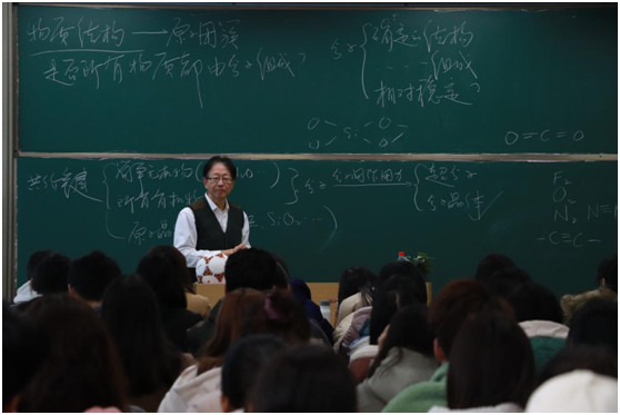 郑兰荪全程板书,通过分子结构、非分子物质的层次和杂化轨道三个部分,给师生们讲解了有关物质结构的知识。他先从“所有的物质都由分子组成”引入,向在座师生说明分子的确定性结构和相对稳定性结构,再从共价键、离子键和金属键拓深到非分子物质——原子团簇。