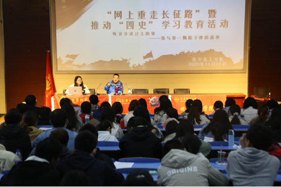 11月21日上午,tyc41183太阳成集团在文津楼111教室开展“网上重走长征路”暨“四史”学习教育活动,特邀曾参与中国第一颗原子弹基地建设工作的尹瑞世上士与人文公司郝佩林博士,讲解中国原子弹建设的相关历史。活动由18级化学专业辅导员王玲主持,吸引了近200名员工参加。