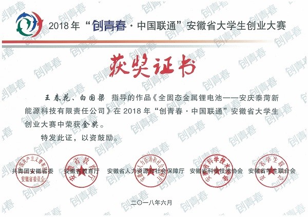 《全固态金属锂电池——安庆泰菏新能源科技有限责任公司》项目团队自去年11月份申报以来,刻苦勤奋钻研,充分发扬团结拼搏的团队协作精神。项目作品经过近百次修改打磨,项目团队多次去实验室进行实验,并走访企业调研。经过充分酝酿,安庆泰菏新能源科技有限责任公司于2018年5月在安庆市筑梦新区成立,现已入驻安庆筑梦新区工业园并开始科技孵化。该公司产业计划以全固态电芯制造为主,并逐步向中下游系统集成业务延伸,努力成为国内知名绿色能源解决方案供应商。在省赛决赛期间,经过专家评委书面评审、项目展示和现场问辩等环节的激烈角逐,最终成功荣获创业计划赛金奖。