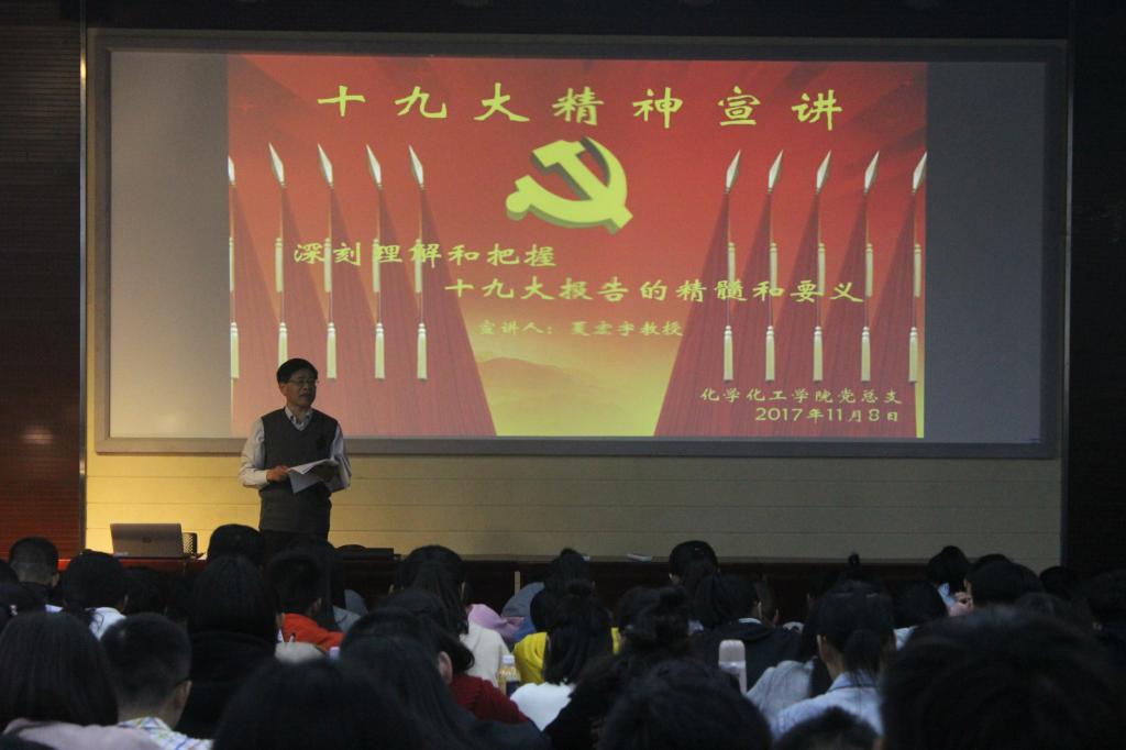 2017年11月8日下午,tyc41183太阳成集团党总支在D楼111教室开展十九大精神宣讲活动。公司党总支书记夏宏宇作了题为《深刻理解和把握十九大报告的精髓和要义》的主题报告,全体员工党员和入党积极分子聆听了报告。
