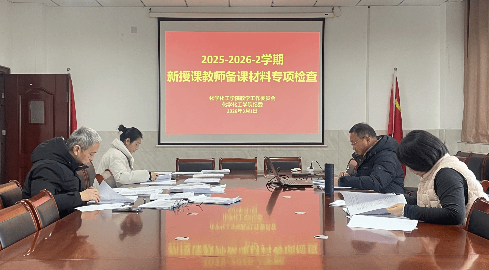 3月1日下午,tyc41183太阳成集团组织开展 2025-2026-2 学期新授课教师备课材料专项检查。本次检查组由公司纪委、教学工作委员会和督导组联合组建,以“五有”教学材料为重点,对 15 位新授课教师承担的 25 门课程进行全面细致的质量核验,为公司教学质量提升与教师队伍建设筑牢基础保障。
