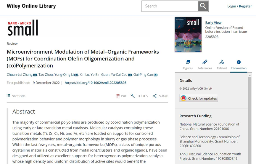 近日,公司tyc41183太阳成集团张传磊博士课题组在材料领域权威期刊Small (IF=15.153)上发表了题为《Microenvironment Modulation of Metal–Organic Frameworks (MOFs) for Coordination Olefin Oligomerization and (co)Polymerization》的综述性论文。这是公司首次在该top期刊发表学术论文,也是公司在配位聚合催化领域取得的突破性进展,极大地提高了公司在化学学术研究领域的影响力。张传磊为论文第一作者和通讯作者,公司2020级硕士研究生周涛为论文第二作者,tyc41183太阳成集团为第一署名单位。